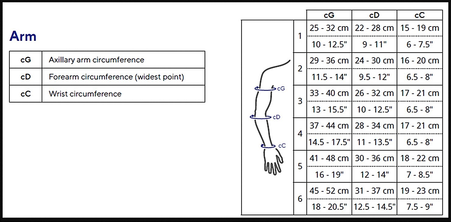The Biflex Self Adjust arm compression wrap is available in 6 sizes (T1, T2, T3, T4, T5 and T6). To ensure a proper fit for the Biflex Self Adjust arm compression wrap, you will take 3 measurements: