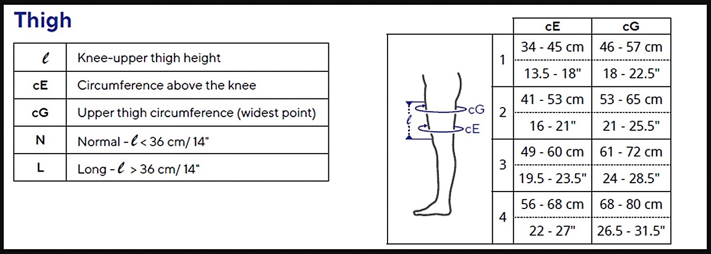The Biflex Self Adjust thigh compression wrap is available in 4 sizes (T1, T2, T3 and T4) and 2 lengths (regular and tall). To ensure a proper fit for the Biflex Self Adjust thigh compression wrap, you will take 3 measurements: