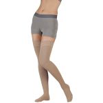 Thigh high compression stockings are specialized hosiery that are designed to provide gradient compression to your full leg. The stockings are tighter at the ankle and gradually decrease in pressure toward the thigh. Thigh high compression stockings help promote the flow of lymph fluid out of your leg, which can reduce the swelling and discomfort associated with lymphedema.